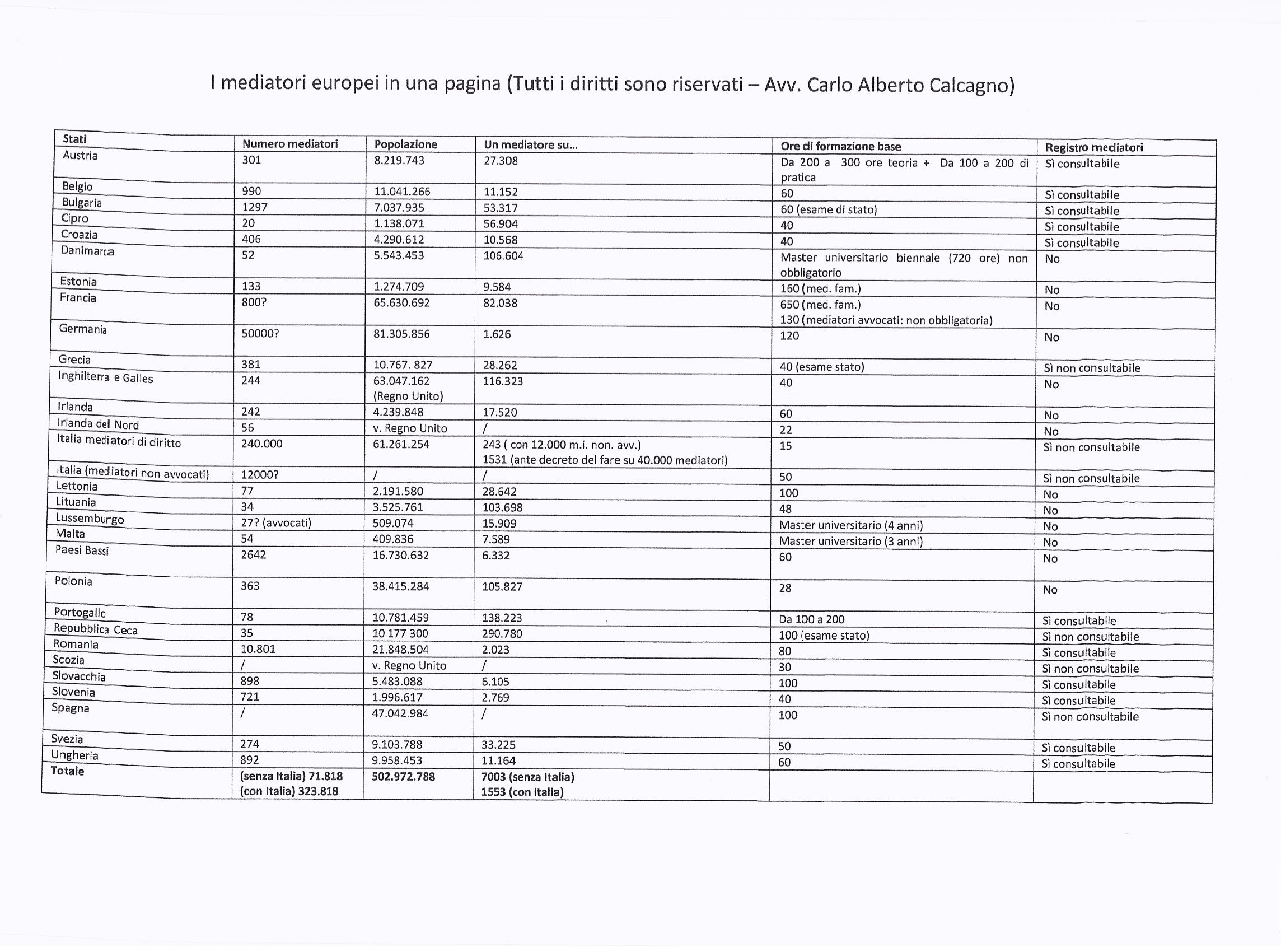 Se consideriamo, infatti, tutti i mediatori oggi presenti nell’UE arriviamo, allo stato delle attuali conoscenze, alla astronomica cifra di 323.818 mediatori: in oggi dunque abbiamo già in Europa 3 volte i mediatori di tutti gli Stati Uniti (senza contare il dato spagnolo).